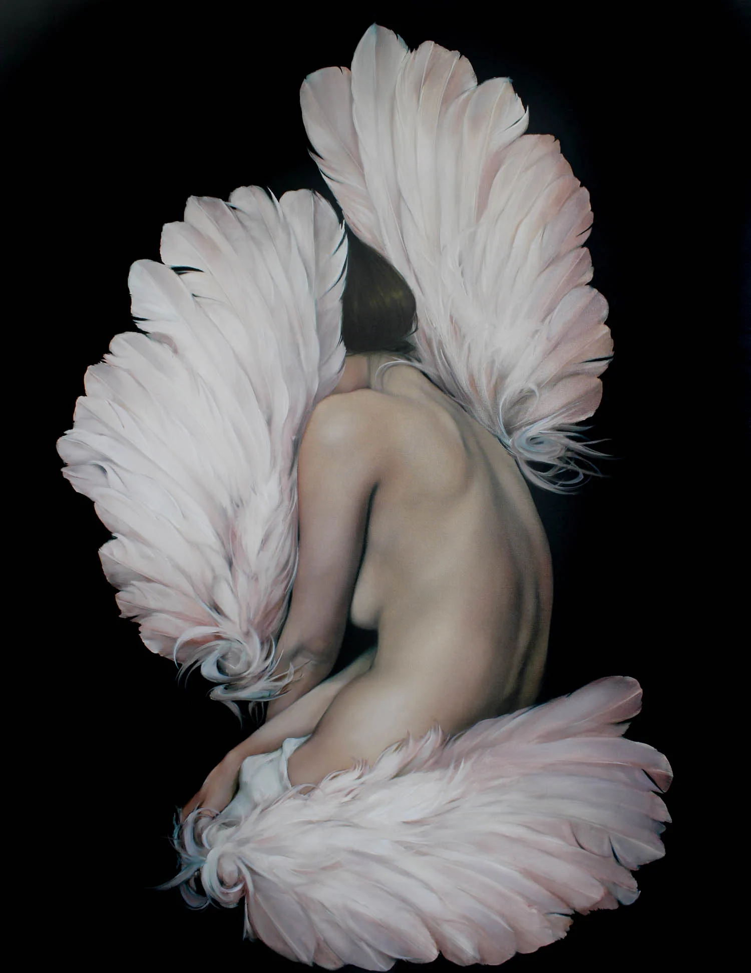 Judd’s paintings possess a distinct style and uniformity. Feathered wings accompany subjects in the majority of her work. Despite wings carrying a generally delicate connotation, the feathers are positioned in a way, similar to armor, to protect the subject. The wings often blindfold the woman, hinting at shielding her from outside influences yet this concept is left up for interpretation. In addition to the feathered armor, Judd also paints images of birds flying to and from the subject; a clear magnetic force exists between the woman and the bird. Birds chronically flying towards and away from the subject as the paintings progress. Though the birds are significant factors in Judd’s art collection, the overwhelming shield of feathers make the paintings breathtaking.