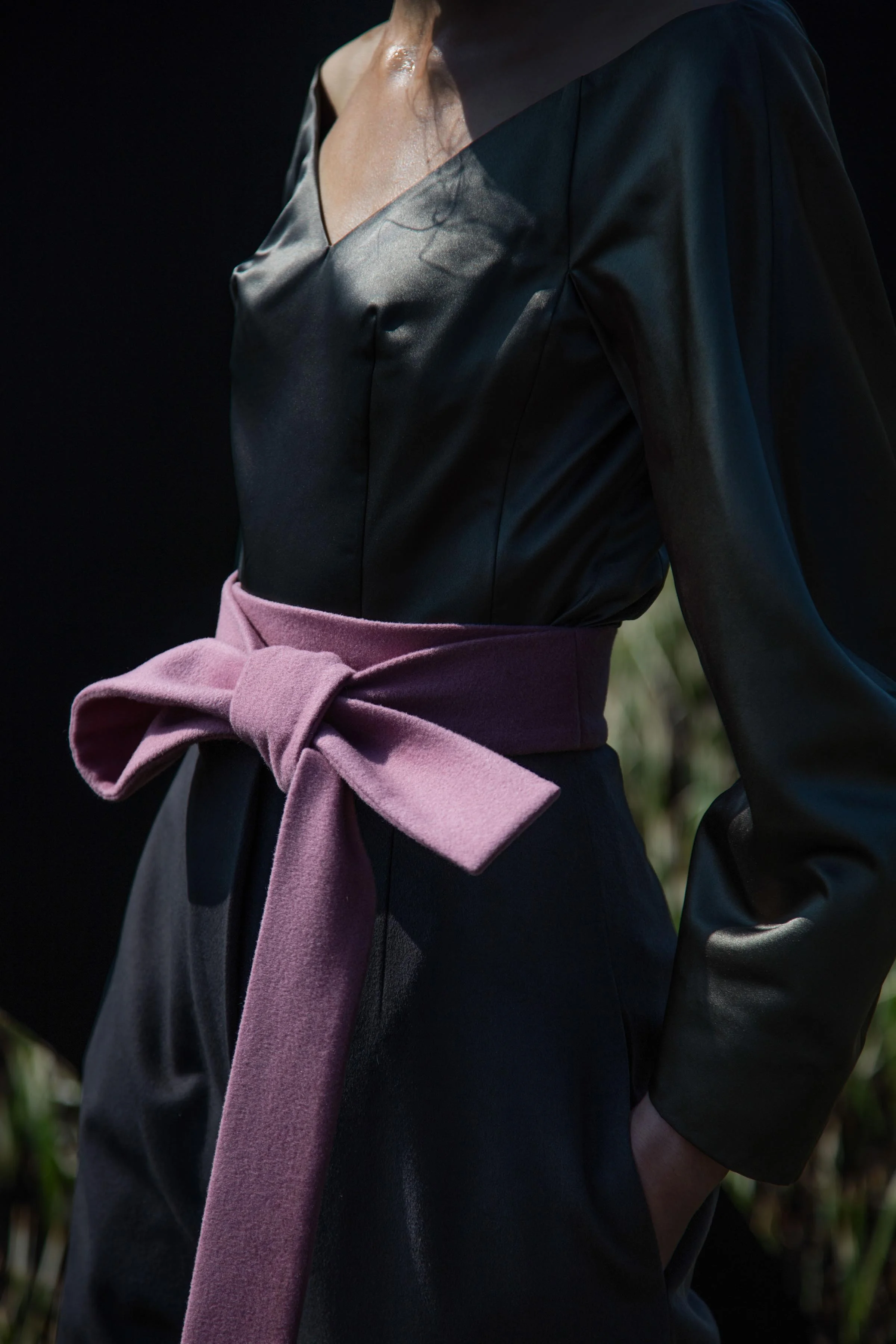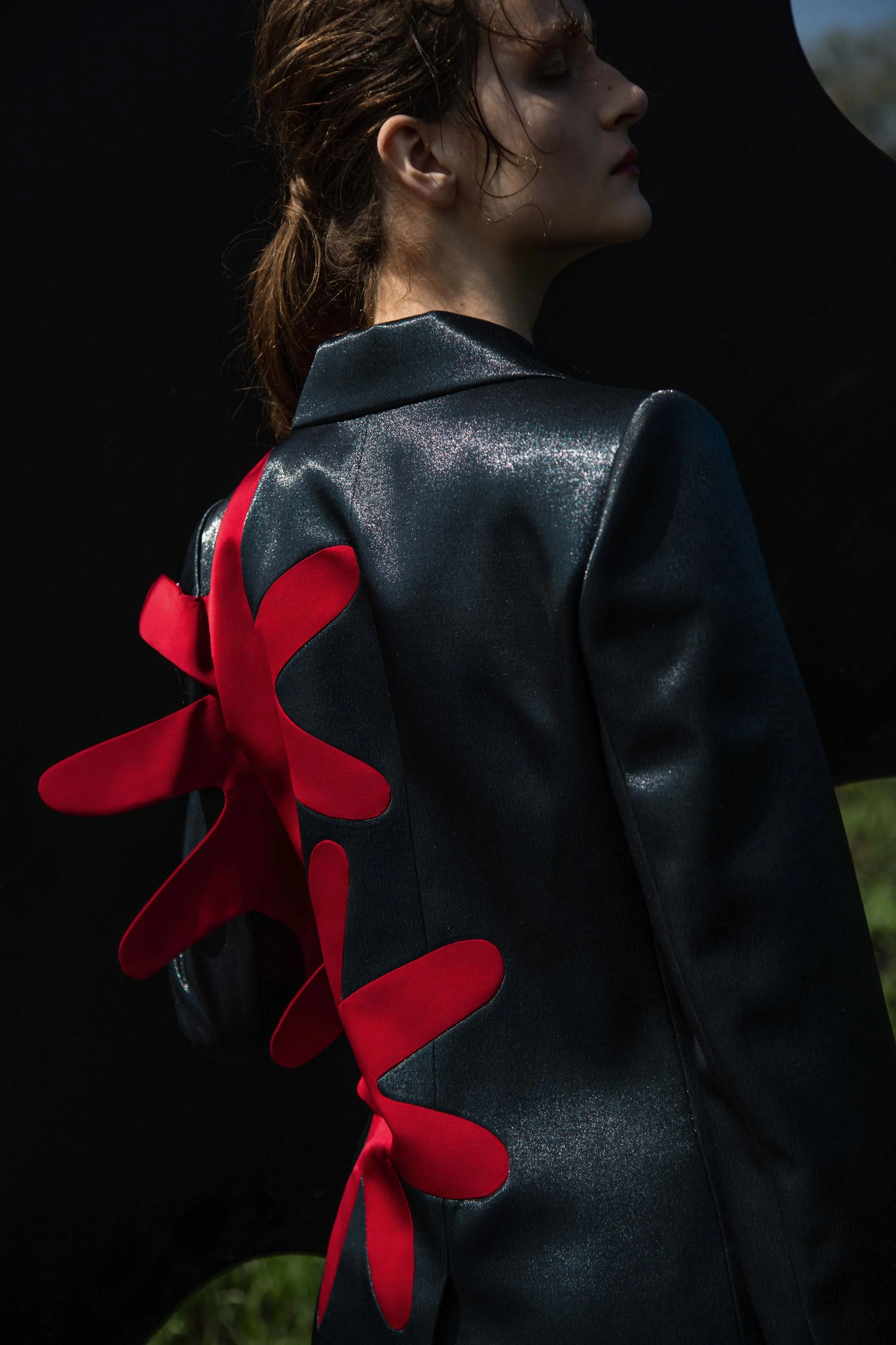 The characteristics QUINT points out is the magnitude behind the symbolism of the flower, its purity, how it thrives and flourishes underneath the warmth of sunlight only to wither and return to the soil, an appealing comparison with humanity stages of birth and death. Through this common bond, we break away from the decay only to burst forth into the light. While the essential concept is the chrysanthemum, QUINT also places attention on light and shadow. Accentuating the beauty of motion in bold and delicate hued long coats with wool overalls, trouser suits, and knee-high boots. Strictly concentrating on the elements of the floral shapes, this dramatically transitions between masculinity and femininity aspects. The progression of "LES FLEUR DU MAL" delivers a visual beauty, how a living creature blossoms and returns to the earth. What I acknowledge most is the attention placed on one small element, assembling a compelling foundation. QUINT develops room for reflection on what becomes of this flower when it returns to the soil. Will it rise from the earth to be reborn anew or will it remain beneath the earth as the chrysanthemum story lives on? I could only depict the designer prevails a similar story to the Phoenix.