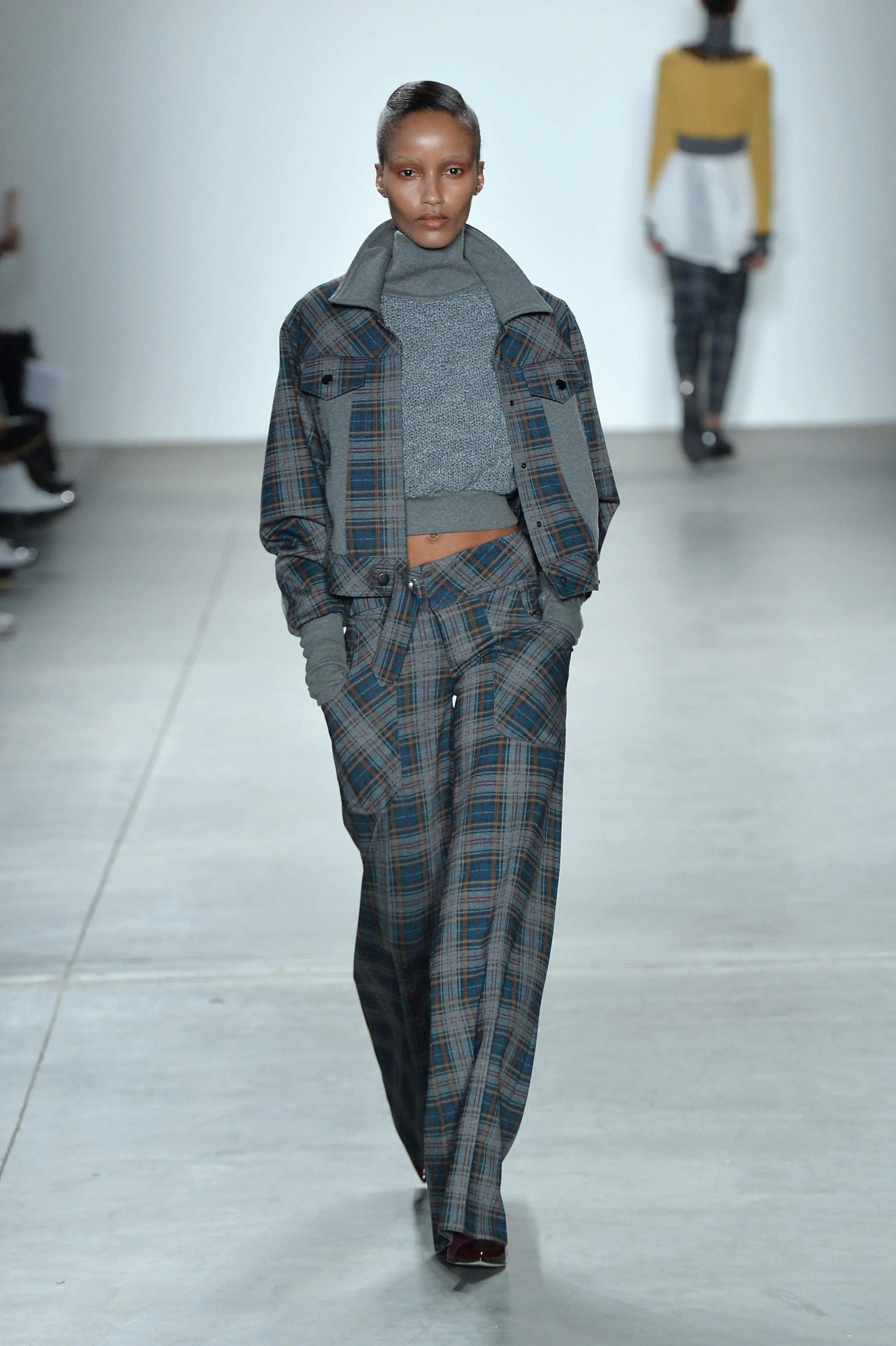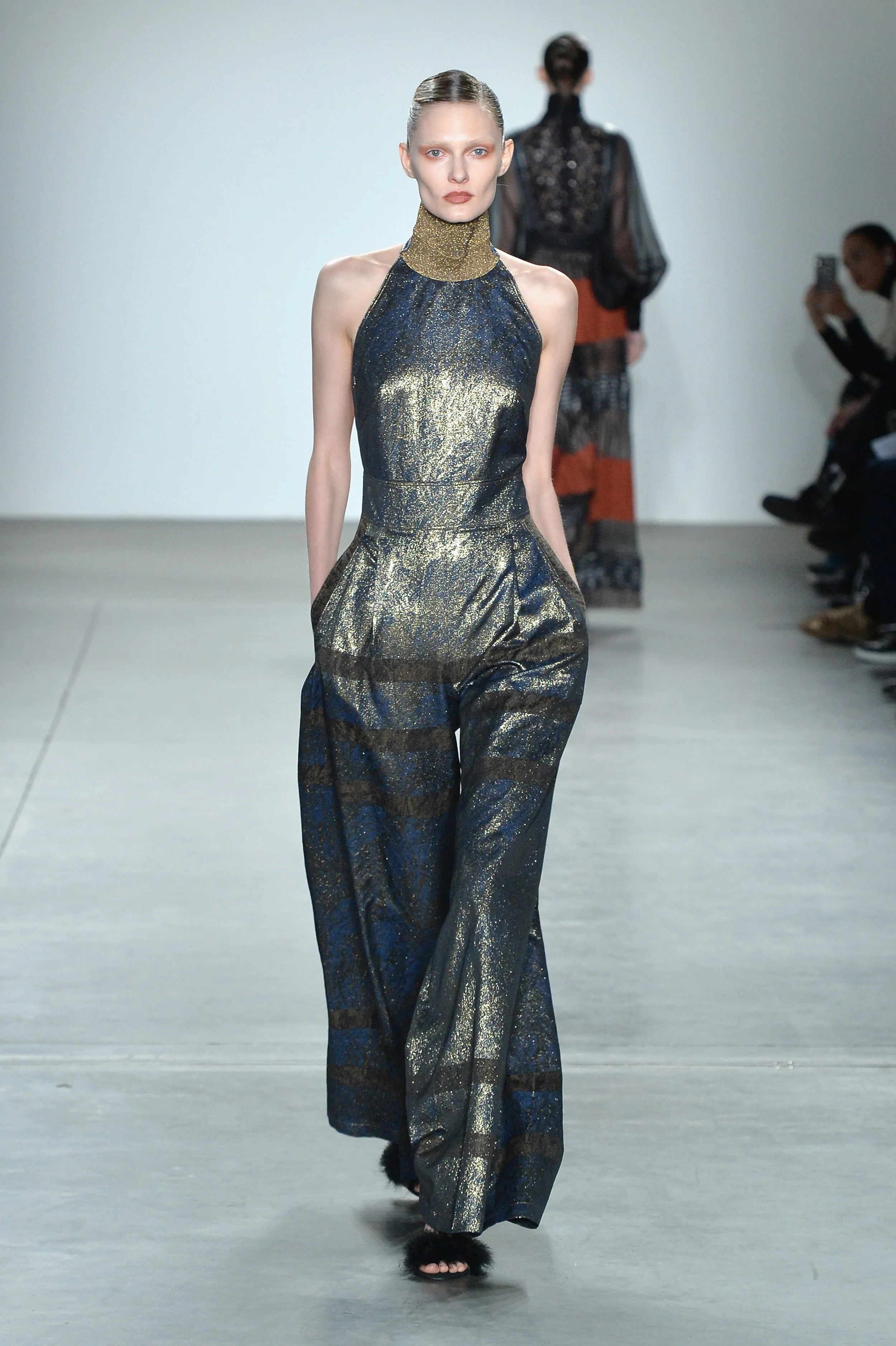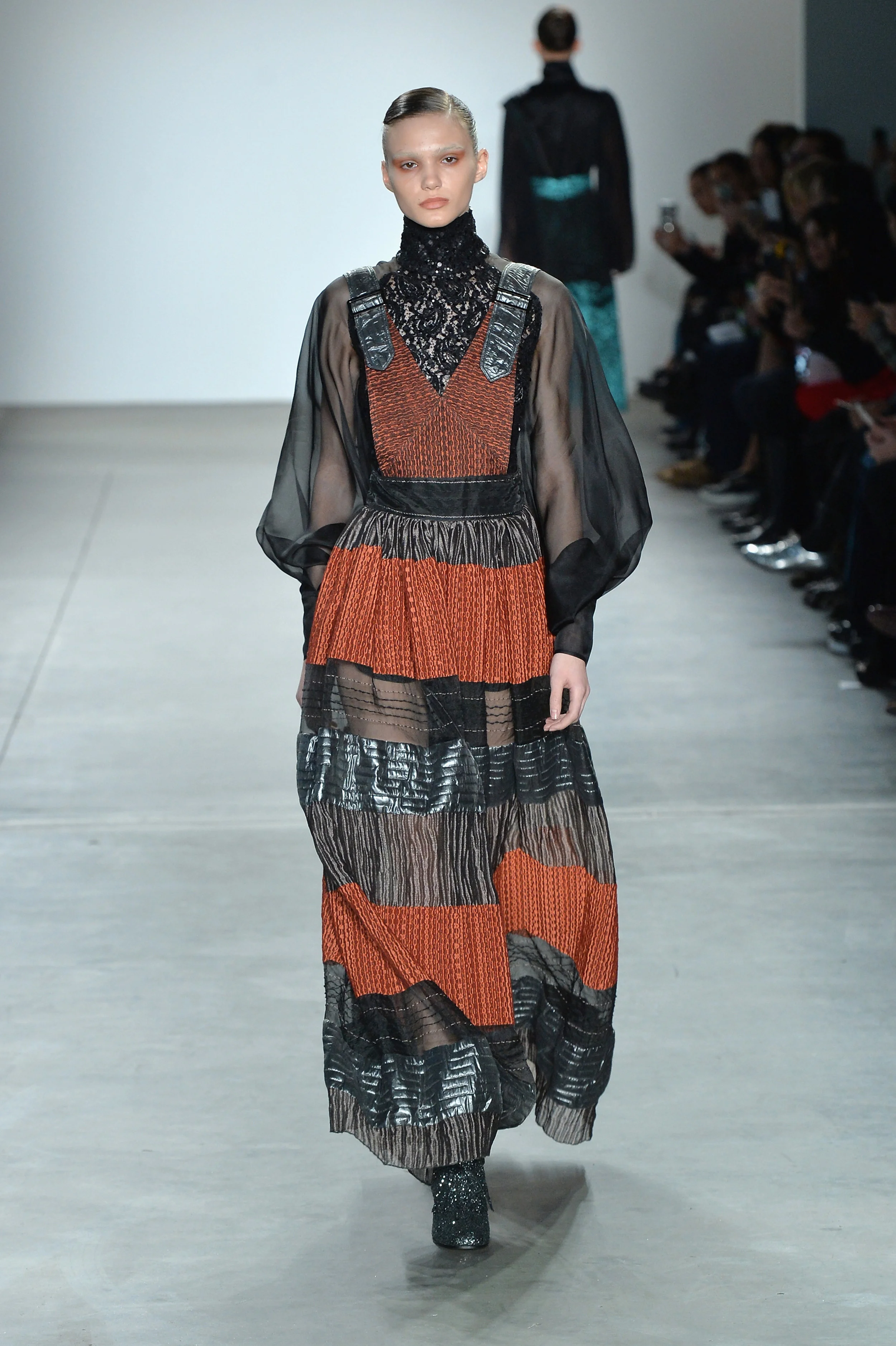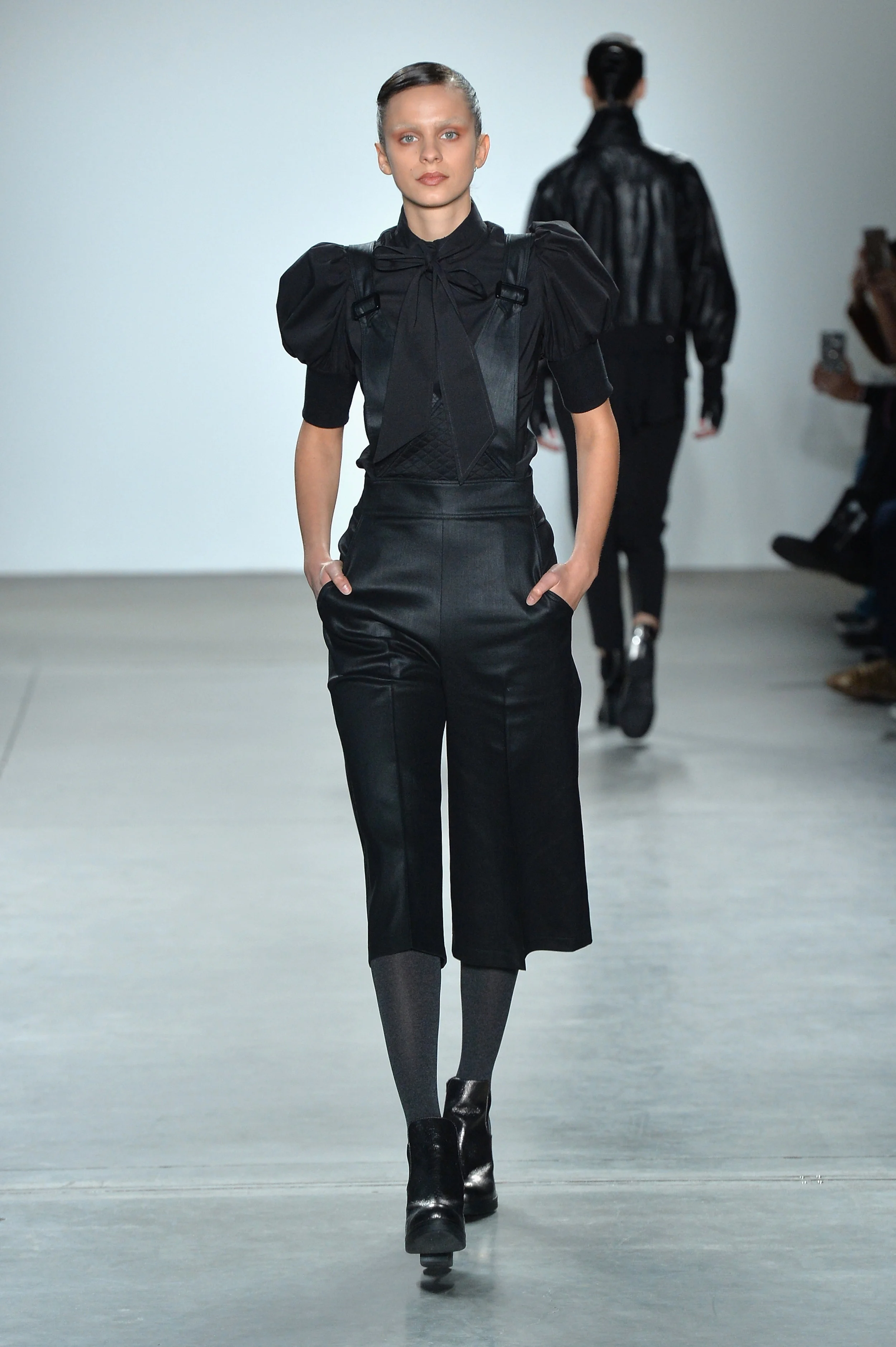 Actually for Louis, denim is a subliminal message to follow it’s the second skin of America and has universal appeal. He’s fond of using denim in the new Fall Winter 2017 collection, plenty of laminated denim in overall culottes, worn with puff sleeve poplin blouses. Black silk cotton dresses with side zippers, turtleneck sweaters and oversized cardigans were a few statement pieces.
