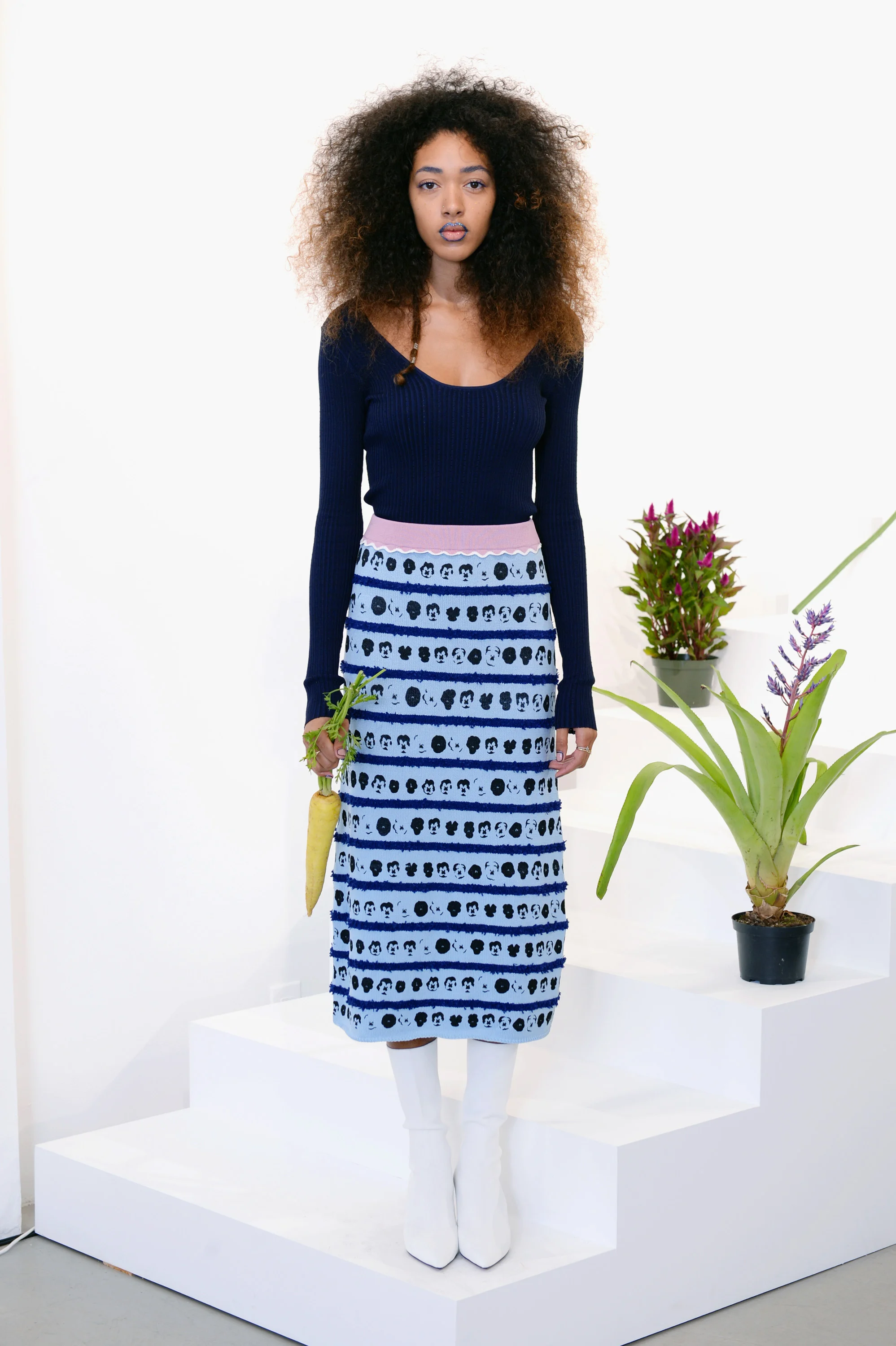 Like Quinn, the designers are constantly playing with the boundaries of real and manufactured. Selecting a diverse cast of models in all ages, gender, and sizes, their idea was to highlight diversity. Fighting against humanity’s desire of controlling what ideal beauty and fashion represent. Presenting a hyper-realist garden of models like Mark Quinn’s oil paintings of still-life arrangements. Pairing the collection with vegetables and flowers together in an artificial landscape. Proportionately constructing a compelling beauty that illustrates the potential of how our future could look.