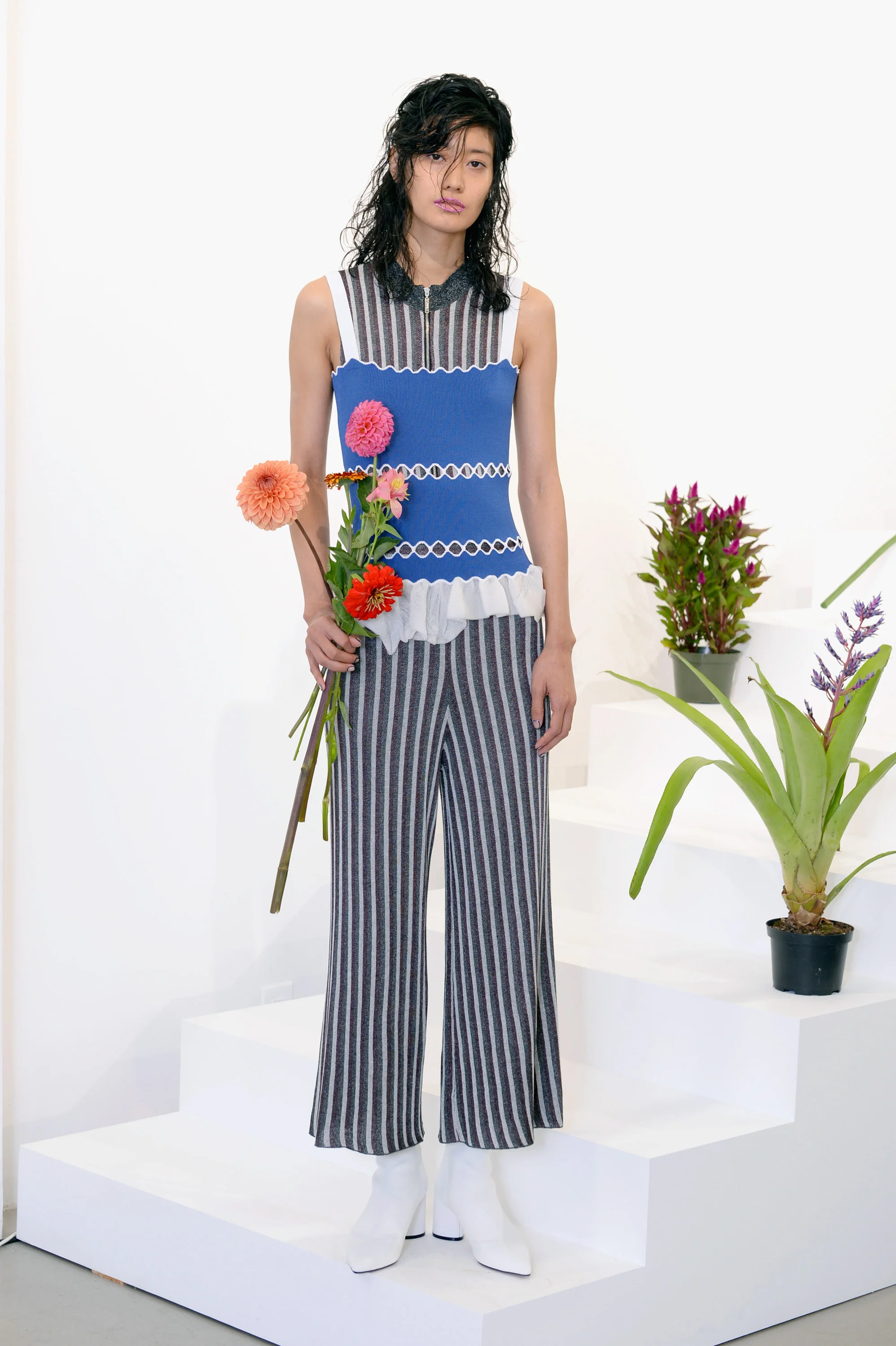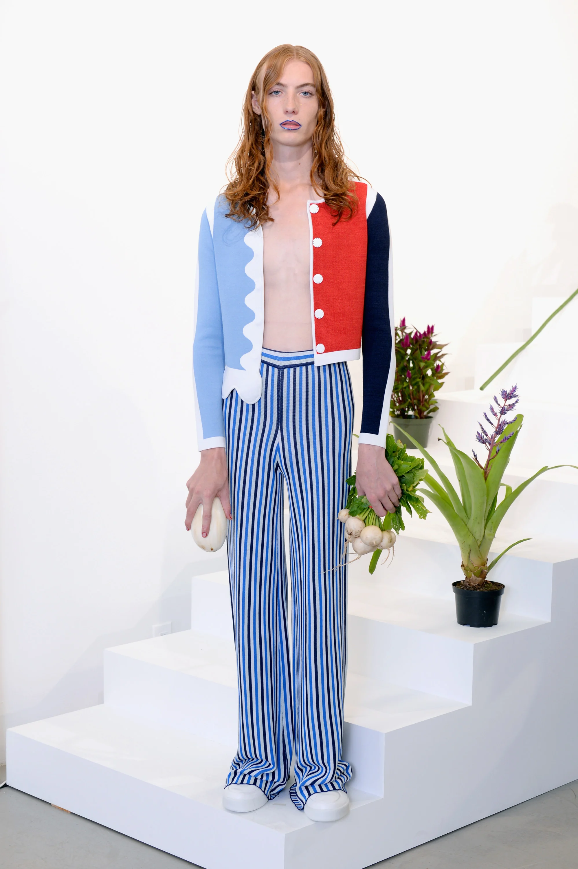 PH5 founder Wei Lin and designer Mijia Zhang evolution of knitwear expands the concept behind a delicate textile. Their passion for leading compositions advances common knitting techniques. When I usually think about knitwear I imagine cashmere sweaters in very cozy gray or white tones. The PH5 SS18 collection is heavily interested in tech fabrications that are unrestrained with a variety of colors, mixing distinctive types of stripes with blue and pink together.